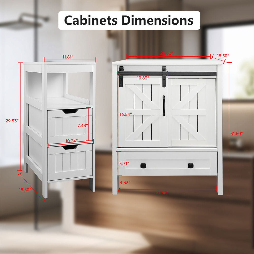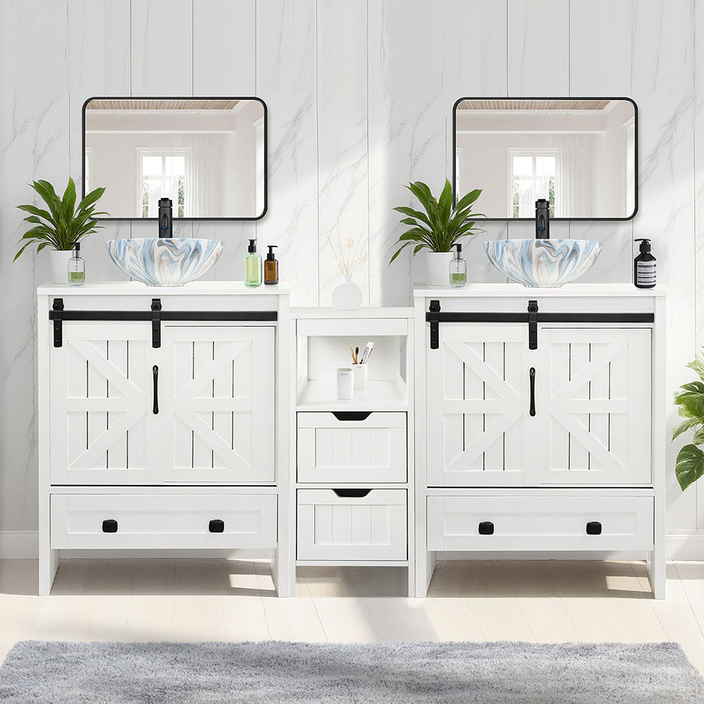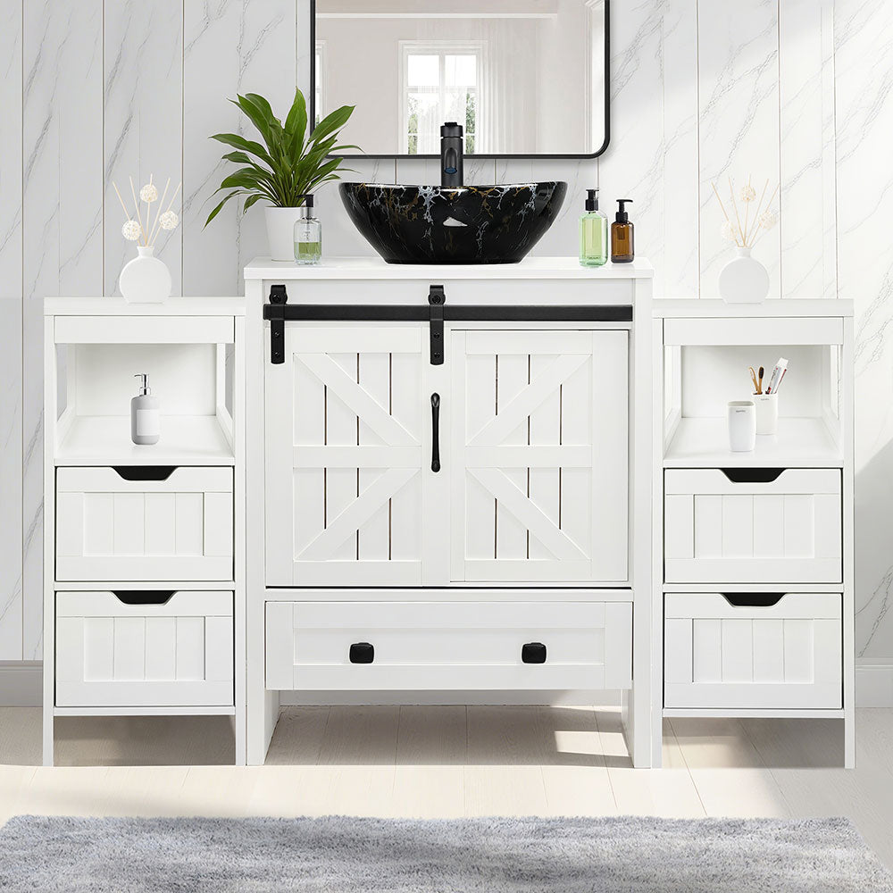 Sigsyl 12-inch floor storage cabinet complements the Farmhouse series with a crisp white finish and versatile functionality, perfectly suited to sit beside the vanity for toiletries and essentials. Featuring four open shelves with two adjustable drawers that can be placed on any level for flexible storage, this high-quality MDF cabinet provides flexible organization for bathroom necessities. Designed to pair seamlessly with the main cabinet and vessel sinks, it extends the modern farmhouse style while offering practical storage, clean lines, and thoughtfully crafted details for a polished, serene space.