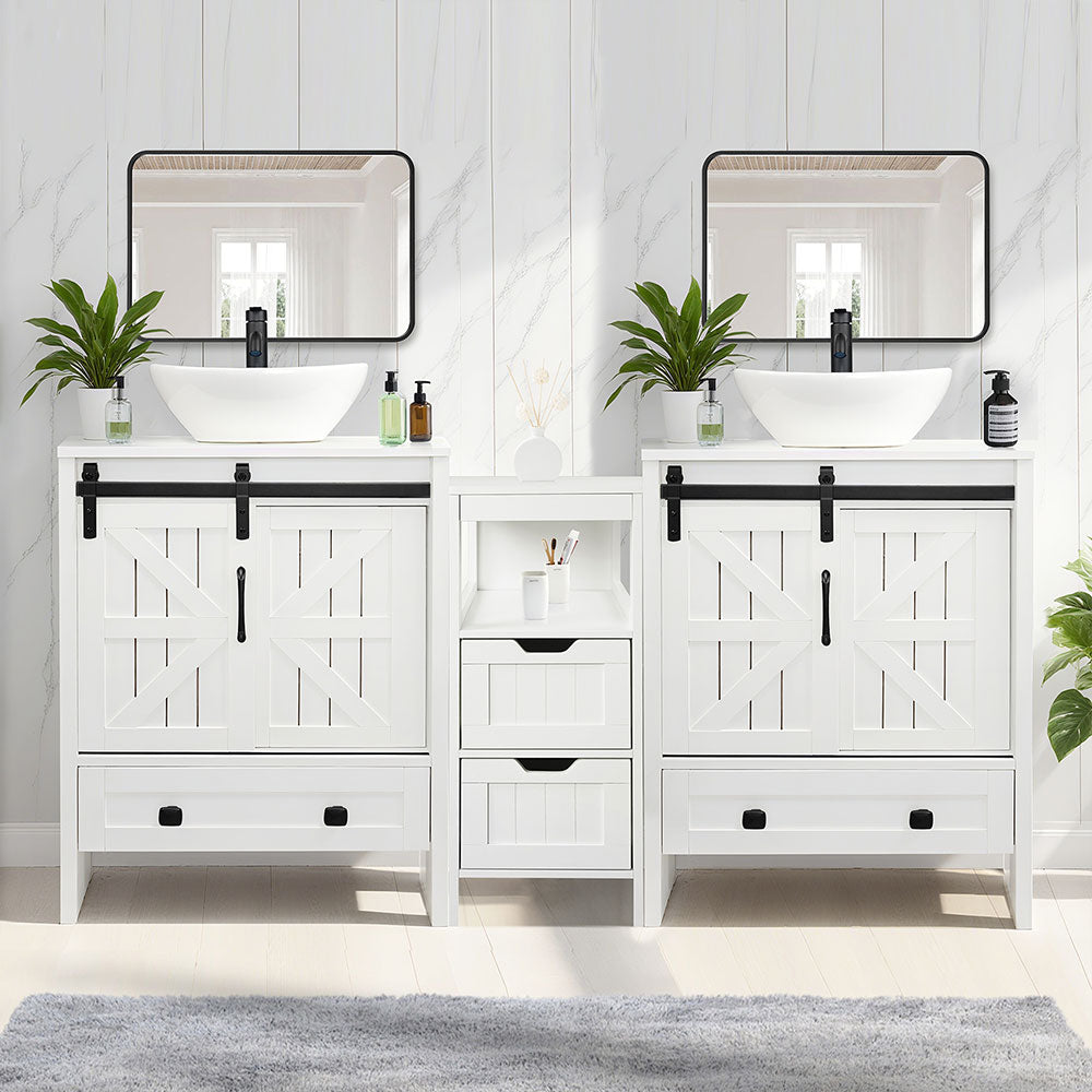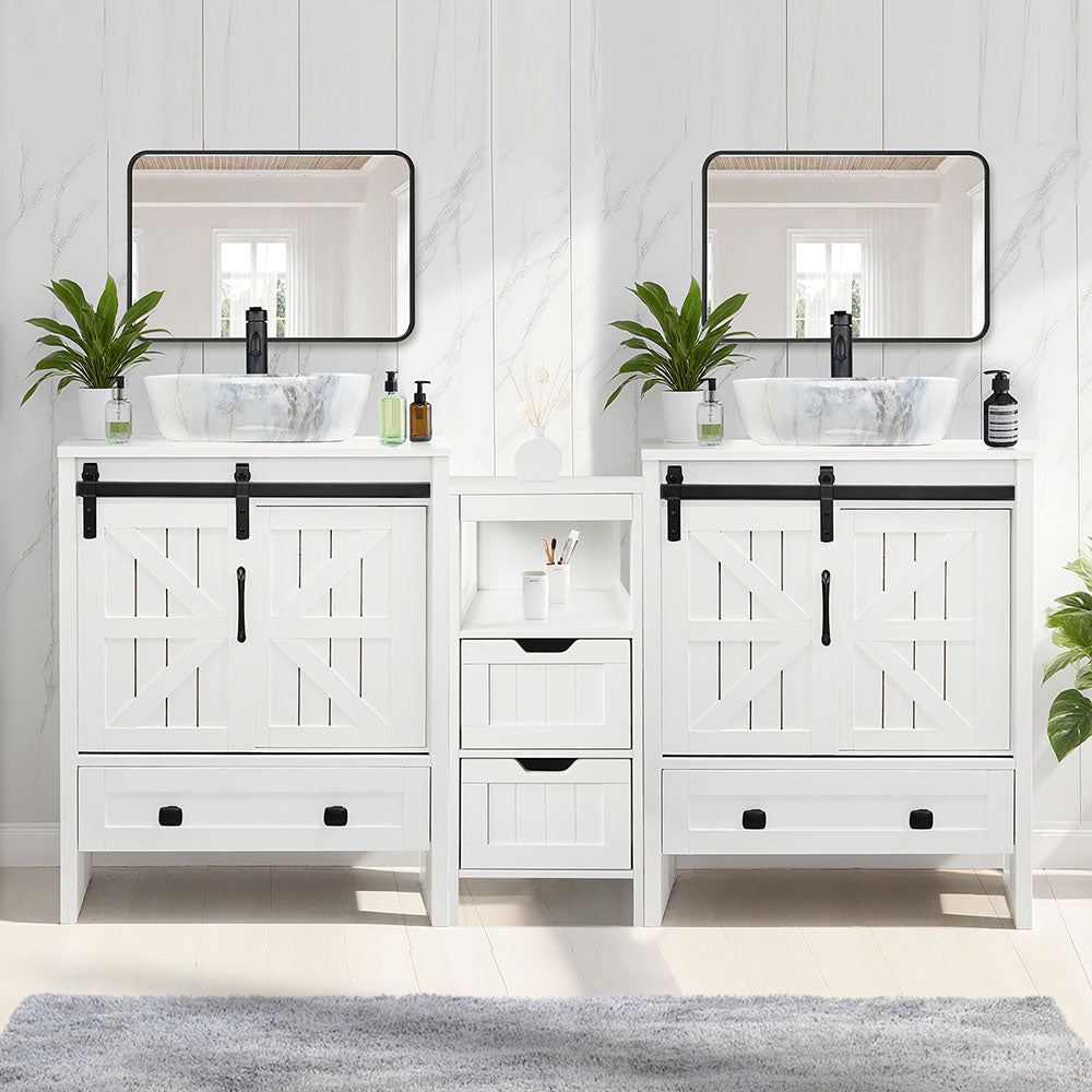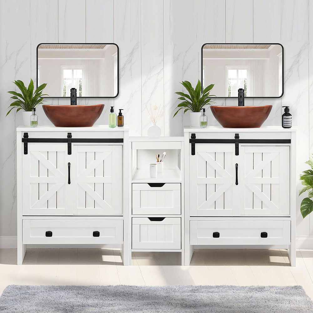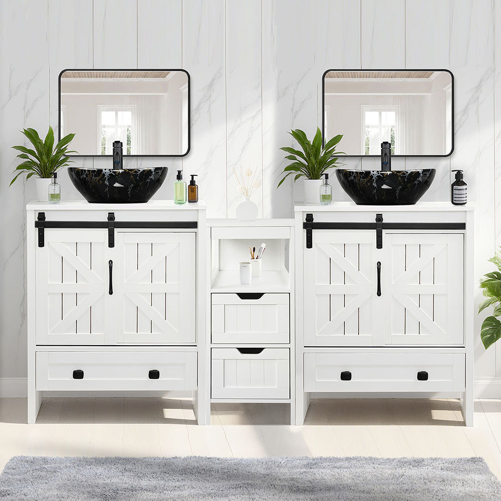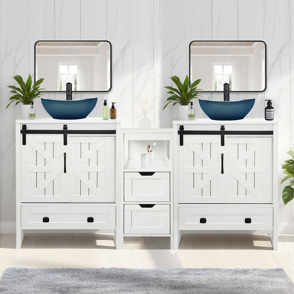 Sigsyl Farmhouse series features a crisp white main cabinet paired with ten unique vessel sinks, from white round, oval, rectangular, and irregular shapes to colorful and marble designs, offering versatile style choices. Combine the main cabinet with the 12-inch floor storage unit to create 24-84 inch customizable vanity sets, letting you design a personalized bathroom. Each vanity set not only serves daily function but also brings a sense of calm and ritual, extending modern farmhouse style with clean, warm, and thoughtfully crafted design.