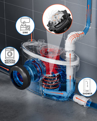 The powerful motor grinds waste and toilet paper quickly, preventing clogs, and pumps it out efficiently with a check valve to prevent backflow. Side and top 1-1/2" inlets allow easy connections to showers and sinks, with built-in check valves.