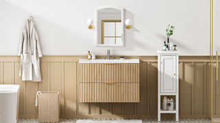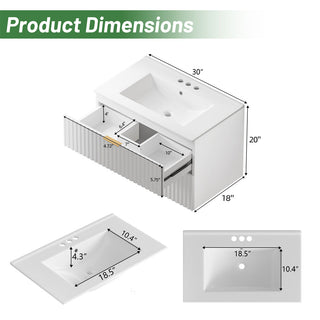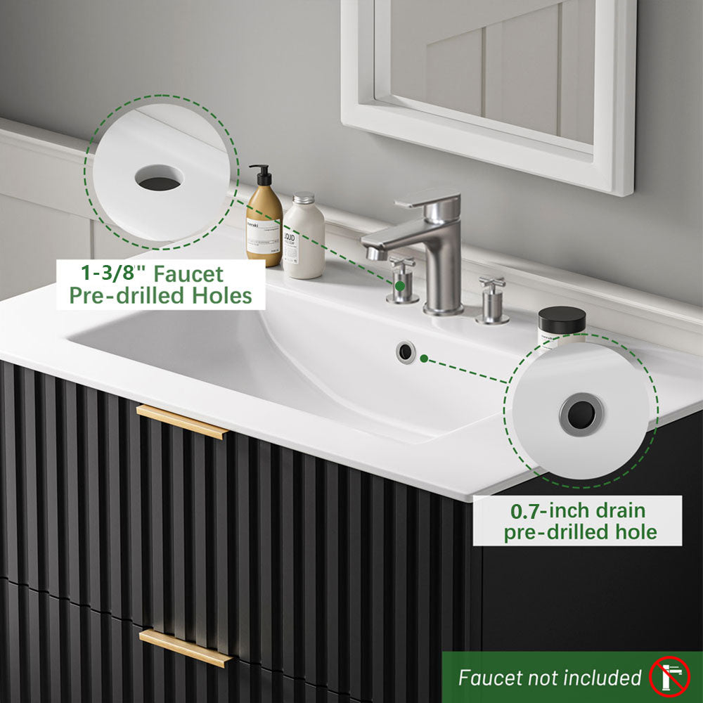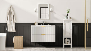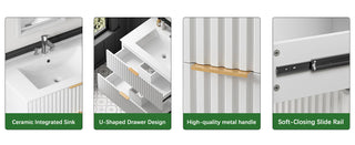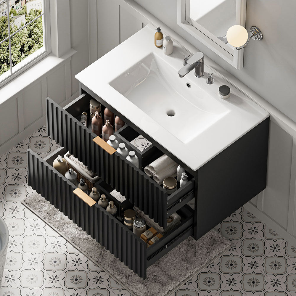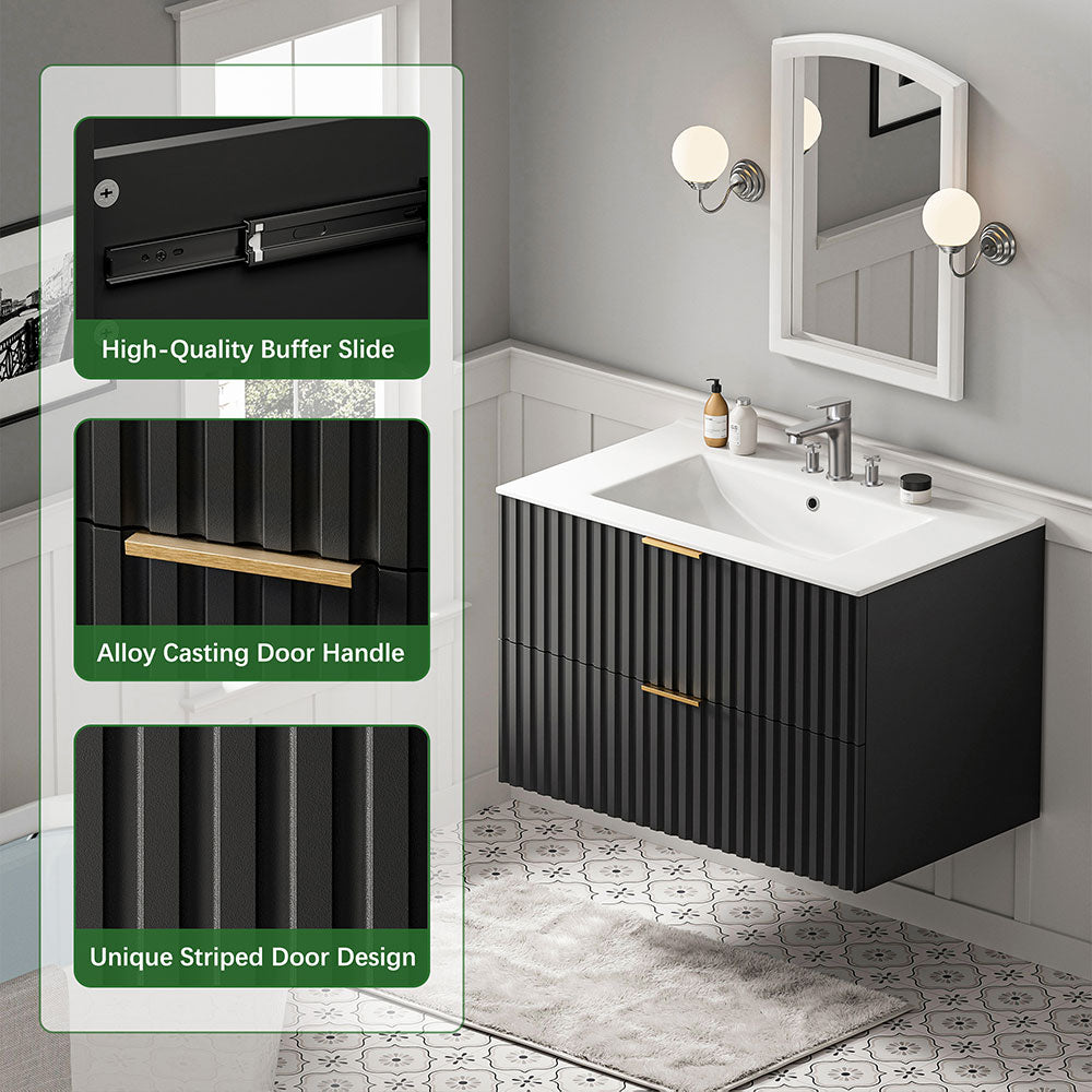 The Sigsoul 30 inch black floating bathroom cabinet blends a bold matte finish with striking brushed gold handles, adding a touch of luxury to its sleek minimalist lines. Featuring two large U-shaped drawers and a durable scratch-resistant surface, this wall mounted bathroom vanity delivers ample storage, creates a dramatic yet sophisticated focal point in any modern bathroom.