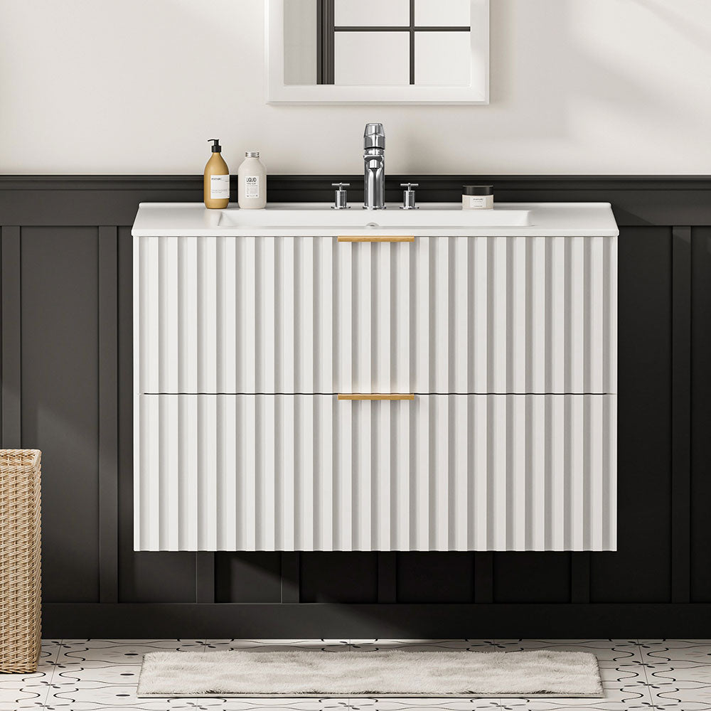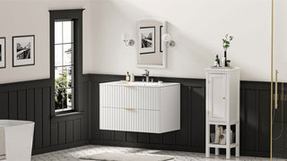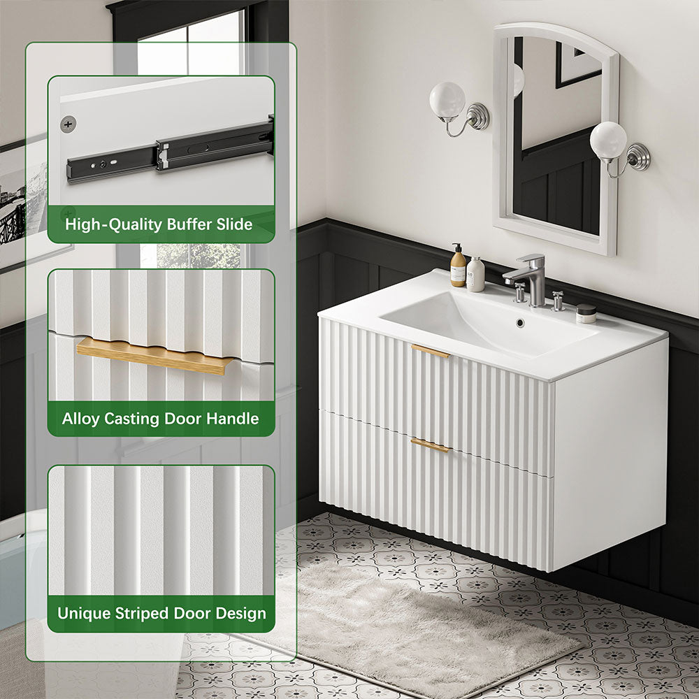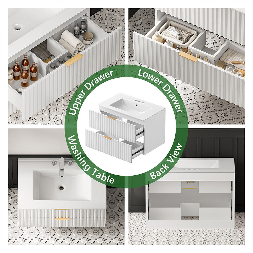 Sigsoul 30 inch white floating bathroom vanity pairs a crisp, clean cabinet finish with elegant brushed gold handles, creating a fresh yet luxurious contrast. Its minimalist linear design and floating sink cabinet style brighten the space, delivering modern sophistication and practical functionality. Two spacious U-shaped drawers, a scratch-resistant finish, and a sleek ceramic sink complete this modern wall hung vanity.